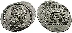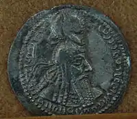 ![]() سکه طلا از سکههای دستهٔ دوم اردشیر، منقوش به شمایل وی و مزین به عبارت «مزداپرست، خدایگان اردشیر شاهنشاهِ ایران که چهره از یزدان میدارد» به دبیره پهلوی[2] | |