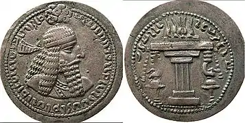 - سرفراز، علیاکبر (۱۳۸۷). «سکههای ساسانی». سکههای ایران از آغاز تا دوران زندیه. تهران: سازمان مطالعه و تدوین کتب علوم انسانی دانشگاهها (سمت). شابک ۹۷۸۹۶۴۴۵۹۴۳۱۱.