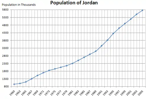 میزان رشد جمعیت اردن بالاست که البته در سالهای اخیر با کاهشی مواجه شده و در حال حاضر به ۸/۲٪ رسیدهاست. یکی از مهمترین فاکتورها در ارتباط با تلاش دولت برای بهبود رفاه اجتماعی شهروندان، ثبات اقتصاد کلان این کشور است که از دهه ۹۰ به این سو محقق و میسر شدهاست. با وجود این، میزان بیکاری در این کشور بالاست. رقم رسمی اعلام شده برای بیکاری در اردن ۵/۱۲٪ و رقم غیررسمی آن حدود ۳۰٪ است. میزان تورم قیمتها پایین است و در سال ۲۰۰۳ به ۳/۲٪ رسید. گردش پول نیز در اردن با ثبات بوده و نرخ ارز آن از سال ۱۹۹۵ با دلار آمریکا تعیین میشدهاست.