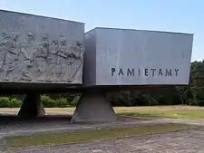 ![]() Monument to victims of Nazi extermination camp Kulmhof (Chełmno) in occupied Poland, unveiled in 1990 at the site of the camp ![]() Chełmno on the map of Nazi extermination camps marked with black and white skulls, جمهوری دوم لهستان borders تهاجم به لهستان | |