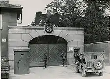 ![]() سربازان آمریکایی از ورودی اصلی اردوگاه کار اجباری داخائو اندکی پس از آزادی آن در ۱۹۴۵ نگهداری می کنند | |