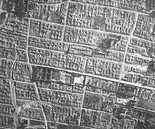 ![]() تصویر هوایی از گتوی ویران شده ورشو، اردوگاه در ساختمان با شکل غیرعادی در نزدیکی وسط تصویر قرار داشت. | |