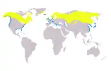| پراکندگی اردک ماهیخوار کاکلی زرد=تابستان; آبی=زمستان; سبز=تمام سال | |