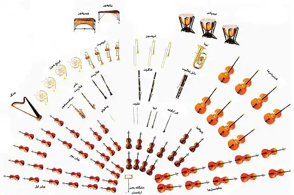 این یک دستهبندی کلی بر اساس نوع ساز در ترکیب ارکستر است. همانطور که در تصویر مشاهده میشود، در سمت چپ رهبر ارکستر، گروه ویولنهای اول و در کنار آن ویولنهای دوم قرار دارند. در کنار ویولنها، ویولاها و در کنار ویولاها، و یولنسلها قرار دارند.