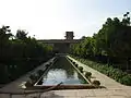 در جبههٔ غربی شاهنشین اصلی که روب روی حوض بزرگ است قرار دارد. این شاهنشین به جای ستونهای سنگی دارای ستونهای چوبی با نقوش تزیین مارپیچ است.چوب این ستونها یک تکه و از جنس چوب سرو است و قسمت بالای آن مقرنس کار شدهاست.(قسمت تحتانی ستون چوبی اخیراً مورد مرمت قرار گرفته) شاهنشین ضلع غربی کاربردی تابستانه دارد.