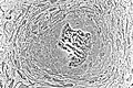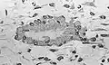 ![]() Osteoblasts (blue) rimming a bony spicule (pink - on diagonal of image). H&E stain. | |