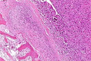 | Intermediate magnification micrograph of an osteosarcoma (center and right of image) adjacent to non-malignant bone (left-bottom of image). The top-right of the image has poorly-differentiated tumor. Osteoid with a high density of malignant cells is seen between the non-malignant bone and poorly-differentiated tumor. H&E stain. | |