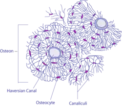 طرز قرار گرفتن و ساختمان ماده بین استخوانی نظم خاصی دارد، بطوریکه املاح معدنی آن به شکل تیغههای مدور متحد المرکزی در کنار هم قرار دارند. به این تیغهها لاملا Lamella میگویند. در مرکز این دوایر متحد المرکز تیغهای شکل، کانال توخالی وجود دارد که حاوی عروق و اعصاب استخوان است. به این کانال یا مجرا کانال هاورس Haversian canal میگویند. یک مجرای هاورس و ۶–۵ تیغه استخوانی دایرهای که دور آن را گرفتهاند یک ساختمان ظریف را درست میکند که به آن سامانه هاورس Haversian system میگویند.