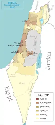 Population density by geographic region, sub-district and district (thicker border indicates higher tier).