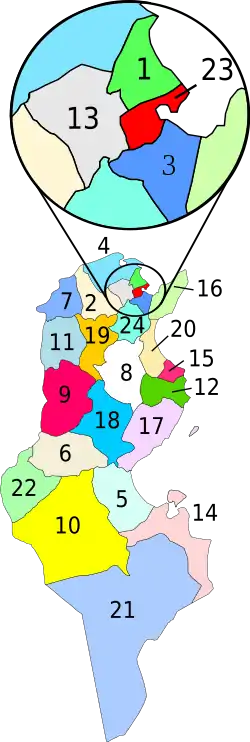 مشارکتکنندگان ویکیپدیا. «Governorates of Tunisia». در دانشنامهٔ ویکیپدیای انگلیسی، بازبینیشده در ۲۶ مارس ۲۰۱۲.