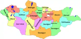 مشارکتکنندگان ویکیپدیا. «Provinces of Mongolia». در دانشنامهٔ ویکیپدیای انگلیسی، بازبینیشده در ۳۰ می ۲۰۲۱.