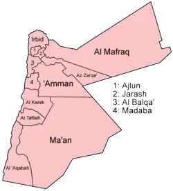 این استان در پایهٔ کوه و در کناره صحرا و در روی تپههای کوچک در وسط کشور اردن واقع شدهاست.