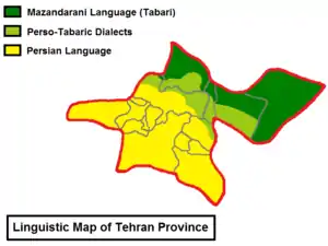 - زبان مازندرانی: زبان مازندرانی[25] با گویشهای مختلف[26] در شهرستانهای فیروزکوه دماوند پردیس شمیرانات و تهران و همچنین شهرهای رودهن و بومهن گویش میشود.[27]