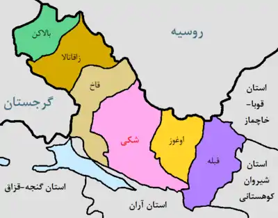نقشهٔ شهرستانهای استان شکی-زاقاتالا.