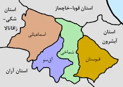 این استان به ۴ قسمت شامل ۴ «شهرستان» یا «منطقه» (Rayon) تقسیم شدهاست و فاقد «شهر تابع جمهوری» (Respublika Tabeli Şəhər) است:[1][2][1][3]