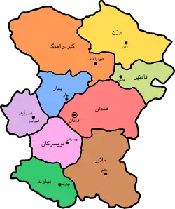 مرکز استان همدان شهر همدان است. این استان دارای شهرستانهای زیر میباشد. استان همدان در سال ۱۳۵۲ از استان کرمانشاه جدا و به استان تبدیل شد.[6][7]