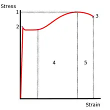 فولاد سازهای یک نمونه از موادی است که رفتار الاستیک-پلاستیک غیریکنواخت، پلاستیک یکنواخت از خود نشان میدهند. در این مواد انتقال از تغییر شکل الاستیک به پلاستیک به صورت کاملاً مشخص است. در این مواد پس از تسلیم (تسلیم بالایی) به دلیل آزاد شدن قفلهای لومر-کاترل و تشکیل نوارهای لودر تنش تا میزان تسلیم پایینی کاهش مییابد.[10] این پدیده، «پدیده نقطه تسلیم» نامیده میشود.[11] در این نوع مواد تنش تسلیم بالایی به شدت به نرخ کرنش وابستهاست بنابراین تنش تسلیم پایینی، تنش تسلیم محسوب میشود.[12][13]