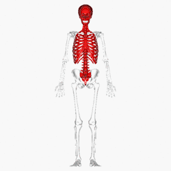 استخوانبندی محوری (اسکلت قرمز رنگ در تصویر) محور عمودی بدن را تشکیل میدهد و شامل سر که خود شامل جمجمه، صورت، استخوانهای شنوایی و استخوان لامی است (۲۹ استخوان)، قفسه سینه (۱۲ جفت دنده و استخوان جناغ سینه) و ستون مهرهها (۷ مهره گردنی، ۱۲ مهره پشتی، ۵ مهره کمری، ۵ مهره بهم متصل خاجی و ۴ مهره بههم جوش خورده دنبالچه مجموعاً ۲۶ استخوان) است. این اسکلتبندی دارای وظایفی چون حفاظت از مغز، نخاع خاری، اندامهای حسی و بافتهای نرم حفره سینه، حمایت از جرم بدن در بخش بالایی پاها میباشد.