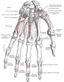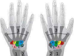 در ردیف ابتدایی مچ دست چهار استخوانچه وجود دارد که بترتیب از طرف شست به طرف انگشت کوچک عبارتند از زورقی Scaphoid، هلالی Lunate، هرمی Triquetral، نخودی Pisiform. در ردیف انتهایی هم چهار استخوانچه قرار دارد که بترتیب از طرف شست به طرف انگشت کوچک عبارتند از چهارپهلو Trapezium، ذوزنقهای Trapezoidium، سَرسان Capitate،چنگکی Hamate.