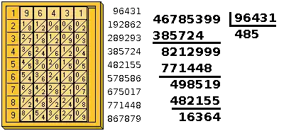 تقسیم با استخوانهای نپر نیز مشابه ضرب آن انجام میگیرد. برای مثال عدد ۴۶۷۸۵۳۹۹ را بر ۹۶۴۳۱ تقسیم میکنیم. چوب خطهای ارقام عدد مقسوم علیه را انتخاب کرده و در کنار هم قرار میدهیم. سپس حاصل جمع هر سطر را در کنار آن مینویسیم. اگر به حاصل جمعهای بدست آمده دقت کنید تعداد ارقام هر یک از آنها برابر ۶ رقم میباشد. به همین دلیل از دو رقم سمت راست مقسوم یعنی ۹۹ صرف نظر میکنیم؛ و بزرگترین حاصل جمعی را که از عد ۴۶۷۸۵۳ کوچکتر میباشد را پیدا کرده و از آن کم میکنیم؛ و رقم مربوط به این حاصل جمع را در خارج قسمت مینویسیم. سپس مطابق تصویر زیر عدد ۹۹ را در کنار تفاضل بدست آمده قرار میدهیم؛ و دوباره شش رقم سمت چپ این عدد را در نظر میگیریم؛ و بزرگترین حاصل جمعی را که از ۸۲۱۲۹۹ کوچکتر است پیدا نموده و زیر آن مینویسیم. به همین ترتیب ادامه میدهیم تا عدد باقیمانده کمتر از مقسوم علیه گردد.