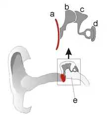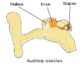 پرده گوش قسمتی از پوست نازکی است که مثل طبل محکم گسترده شدهاست و به اولین استخوانچه چسبیدهاست این استخوان کوچک استخوان چکشی نامیده میشود. استخوان چکشی به وسیله رباطهای ریزی به استخوان کوچک دیگری چسبیدهاست که به آن سندانی گفته میشود؛ بهطوری که با حرکت استخوانچه چکشی، استخوانچه سندانی هم همراه آن حرکت خواهد کرد. انتهای دیگر استخوانچه سندانی به تنه کوچکترین استخوان در بدن متصل است که به آن رکابی میگویند.[2] حرکت لرزش استخوان سندانی، رکابی را در هنگامی که به داخل و خارج حلزون در سوراخ بیضی حرکت میکند به نوسان وامیدارد.