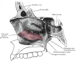 ![]() Medial wall of left orbit. (Inferior nasal concha visible in center in yellow.) | |