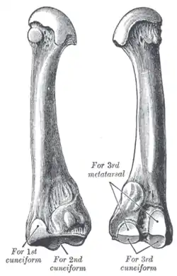 ![]() استخوانهای پای راست. سطح پشتی. استخوان متاتارسال دوم، استخوان زرد رنگ دوم از سمت چپ است. | |