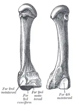 ![]() استخوانهای پای راست. سطح پشتی. استخوان متاتارسال سوم، استخوان زرد سوم از سمت چپ است. | |