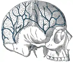 ![]() Veins of the diploë as displayed by the removal of the فرق سر. | |