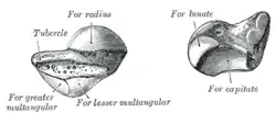 | مفاصل | با پنج استخوان مفصل میشود radius proximally trapezoid bone and چهارپهلو distally استخوان چهارپهلو and هلالی medially |