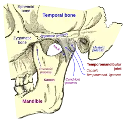 زائده برجسته گونهای (زایگوماتیک) برای اتصال به استخوان گونهای به سمت جلو امتداد یافته و قوس گونه را تشکیل میدهد. درست زیر پایه زائدهٔ گونهای یک فرورفتگی به نام گودی زیروارهای (مندیبولار فوسا) قرار دارد که برآمدگی استخوان فک پایین برای تشکیل مفصل گیجگاهیزیروارهای (تمپورومندیبولار) دقیقاً جلوی کانال گوش در آن قرار میگیرد.