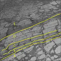 تصویر سمت چپ (خاکستری) تغییر رنگ لایههای بستر را نشان میدهد. لایه "A" نزدیکتر به مریخنورد و بالاتر از لایههای "B" تا "E" است. بافت و شیمی سنگ نیز با عمق متفاوت است؛ بنابراین دانشمندان استنباط میکنند که سن این لایهها از الگوی مشابهی پیروی میکند و لایههای بالاتر از لایههای پایینتر جوان هستند.[4]