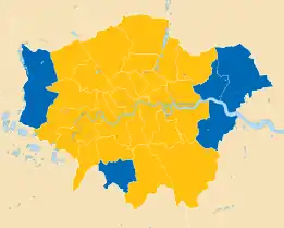 لندن وضعیت آرا اکثریت نواحی در رایگیری برای برگزیت. آبی: ترک. نارنجی: بقا