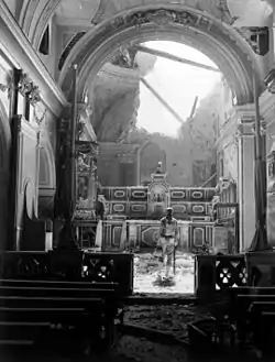 ![]() Pvt. Paul Oglesby, of the U.S. 30th Infantry, standing in reverence before an altar in a damaged Catholic Church in Acerno | |