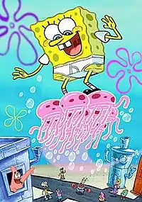 ![]() Promotional artwork for the episode by Sherm Cohen depicting باباسفنجی (شخصیت) and the عروس دریایی flying together with various residents watching them | |