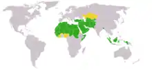دین اسلام حدود یک میلیارد و هشتصد میلیون نفر پیرو دارد که دومین دین پرجمعیت دنیا بهشمار میآید. اسلام سریعترین دین از لحاظ گسترش و رشد در میان ادیان جهان است.[14] گستره جغرافیایی اسلام از صحرای بزرگ آفریقا تا جنوب شرق آسیا است، همچنین جوامع اقلیتهای مسلمان نیز در سرتاسر جهان پراکنده هستند. در جهان غرب و کشورهای جهان اول، اسلام کماکان درحال افزایش است.[15] اسلام دومین یا سومین دین پرجمعیت در اروپا و قاره آمریکا میباشد.[16]
