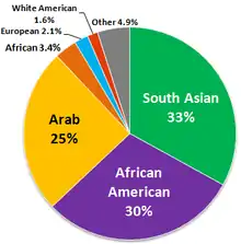 از نظر نژادی، امروزه ۳۳٪ مسلمانان ایالات متحده را آمریکاییان آسیایی جنوب و جنوب شرقی، ۳۰٪ را آفریقایی آمریکاییها، ۲۵٪ را آمریکاییان عرب تبار، و ۳٫۴٪ را آمریکاییان آفریقایی، ۲٫۱٪ را آمریکاییان اروپایی، ۱٫۶٪ را سفید پوستان آمریکایی و ۴٫۹٪ مسلمانان آمریکا را دیگر نژادها تشکیل می دهند.[39] بزرگترین کانون مسلمانان عرب تبار در ایالت میشیگان آمریکا است. رشد جمعیت مسلمانان آمریکا در حدود ۶٪ در سال تخمین زده شدهاست.[40]