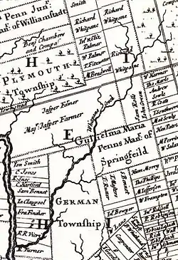 ![]() Detail of Thomas Holme's 1687 map of Pennsylvania. Spring Mill is located along the left border, at the bend in the Schuylkill River. | |