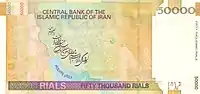 طرح پشت این اسکناس نقشه ایران با تأکید بر نام خلیج فارس به انگلیسی در پایین آن است و در گوشه نقشه ایران نماد انرژی هستهای به چشم میخورد که در آن یکی از احادیث پیامبر اسلام به زبان فارسی و با خط شکسته نستعلیق بدین مضمون چاپ شدهاست:. دانش اگر در ثریا هم باشد مردانی از سرزمین پارس بر آن دست خواهند یافت. [1][2][3][4]
