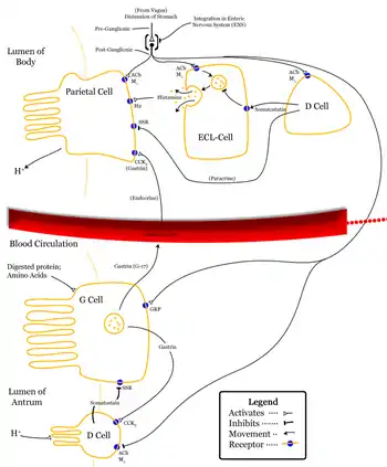 یکی از فراوردههای پایانی سوخت وساز بدن گاز کربن دی اکسید (CO۲) است. بر اثر آبپوشی گاز کربن دی اکسید گاز کربنیک اسید تولید میشود و از یونش این اسید کاتیون هیدروژن مثبت (H+) تولید میشود، البته این واکنشها در پلاسمای خون رخ میدهند. با عبور خون از کنار سلولهای یاد شده یونهای H+ طی فرایندی به نام انتقال فعال سلولی ازمیان غشای این سلولها عبور کرده و وارد معده میشود. آنزیمها این فرایند را تسریع میکنند سپس برای حفظ توازن الکتریکی به همان تعدادیونCl- نیز از پلاسمای خون وارد معده میشود. پس از ورود این یونها به معده، غشای سلولها از بازگشت دوباره آنها به پلاسما جلوگیری میکند. وجود محیط اسیدی قوی در معده برای هضم غذا و فعال کردن برخی آنزیمهای گوارشی لازم است.