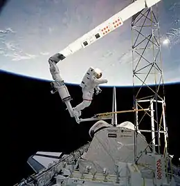 ![]() فضانورد جری ال راس در حال تمرین ساخت و ساز سازه در فضا در طی یک راهپیمایی فضایی. | |||||