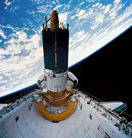 ![]() دیسکاوری در حال قرار دادن TDRS-7 در مدار خود | |||||