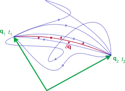 یعنی سیستم مسیری را در فضای پیکربندی برمی گزیند که کنش برای آن ثابت است، با شرایط مرزی ثابت در آغاز و انتهای مسیر.