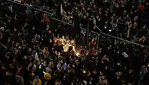 - روز شنبه ۲۱ دی ۱۳۹۸ در پی تأیید رسمی نقش سپاه پاسداران در ساقط کردن هواپیمای مسافربری اوکراینی، دانشجویان و مردم معترض مقابل دانشگاههای امیرکبیر و صنعتی شریف تهران در اعتراض به حادثه شلیک موشک سپاه پاسداران به هواپیمای مسافری اوکراین و پنهانکاری مقامات جمهوری اسلامی دست به تجمع و تظاهرات زده و علیه «دروغگویی» و «پنهانکاری» مسئولان حکومت شعار دادند[6][7][8] و خواستار استعفای علی خامنهای به عنوان فرمانده کل نیروهای مسلح شدند.[8]