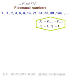 ۱, ۱, ۲, ۳, ۵, ۸, ۱۳, ۲۱, ۳۴, ۵۵, ۸۹, ۱۴۴, ۲۳۳, ۳۷۷, ۶۱۰, ۹۸۷, ۱۵۹۷, ۲۵۸۴,…