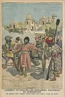 در سال ۱۸۸۰ عبدالرحمنخان به امارت افغانستان رسید و به واسطهٔ سبعیت و اتکایش به قوهٔ قهریه بین ناظران خارجی به امیر آهنین (به انگلیسی: Iron Emir) شهرت یافت.[78][79] به تخمین یک منبع، امیر آهنین در هر سال از امارت خود بهطور متوسط ۵۰۰۰ نفر را اعدام میکرد و یکی از روشهای معمول این اعدامها بستن به دهانهٔ توپ بود.[80] به عنوان مثال تنها در دسامبر ۱۸۸۹، بیست و چهار نفر در ناحیهٔ ترکستان را به دستور عبدالرحمنخان به توپ بستند.[81]