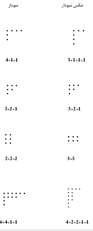 عکس نمودار یک افراز n، مجدداً نمودار یک افرازn است. اگر نمودار اولیه افرازی با kجمعوند را نشان دهد (یعنی دارای k سطر باشد)، آنگاه عکس نمودار در اولین (بزرگترین) سطر دارایk نقطه است و بنابراین افرازی با ماکسیمم جمعوند k را نشان میدهد، مثلاً، افراز ۱۲ به ۴ جمعوند، یعنی، نمودار زیر را دارد.