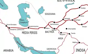 جاده ابریشم در قرن اول پیش از میلاد مسیح پدیدار شد و افغانستان با تجارت رونق گرفت و مسیرهای آن به چین، هند، ایران و شمال به شهرهای بخارا، سمرقند و خیوه در ازبکستان کنونی رسید.[51] در این مرکز، کالاهای مانند ابریشم چینی، نقره ایرانی و طلای رومی مبادله میشدند، در حالی که منطقه افغانستان کنونی استخراج و تجارت سنگهای لاجورد را انجام میداد[52] که عمدتاً از منطقه بدخشان بود.