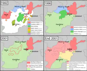 افغانستان در دههٔ ۱۹۷۰ میلادی پس از انقلاب ثور، که تأثیر یافته از اتحاد جماهیر شوروی بود، به حکومتی سوسیالیست تبدیل شده و شاهد جنگی طولانی با مجاهدین افغان بود که در طول یک دهه، جان بیش از دو میلیون غیرنظامی را گرفت و باعث آواره شدن بیش از پنج میلیون نفر شد. پس از چند کودتای پیدرپی و پیروزی مجاهدین بر دولت محمد نجیبالله جنگ داخلی افغانستان آغاز شد و وارد دورهای از جنگ میان احزاب مختلف مجاهدین شد. طالبان در میانههای دهه ۱۳۷۰ کنترل بیشتر مناطق افغانستان را به دست گرفتند. اما با یورش ائتلاف بینالمللی به رهبری آمریکا در سال ۱۳۸۰ حکومت را از دست دادند. در دسامبر ۲۰۰۱، شورای امنیت سازمان ملل متحد نیروهای بینالمللی کمک به امنیت (ایساف) را مأمور کمک به حفظ امنیت و دولت جدید افغانستان به ریاست حامد کرزی کرد.[30] افغانستان در حال حاضر در عین حال که با مقاومت مسلحانه طالبان و گروههای دیگری همچون شبکه حقانی در پاکستان و داعش درگیر است به کندی و با حمایت جامعه بینالمللی در حال بازسازی است.[31]