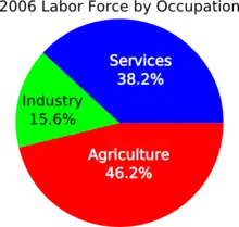 | نیروی کار بر پایه شغل | خدمات (۴۴٫۲٪)، صنعت (۱۶٫۸٪)، کشاورزی (۳۹٪) (برآورد ۲۰۰۸).[3] |